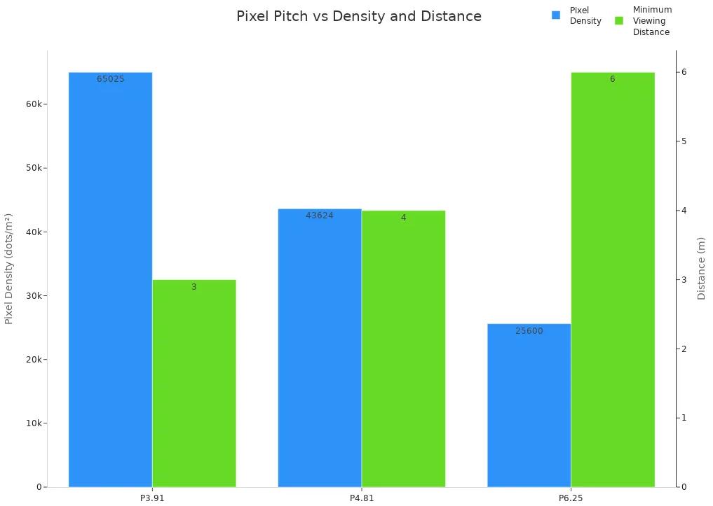 Pixel pitch tells you how close the pixels are. Smaller pixel pitch gives sharper pictures. For outdoor screens, match pixel pitch to how far people stand from the screen.