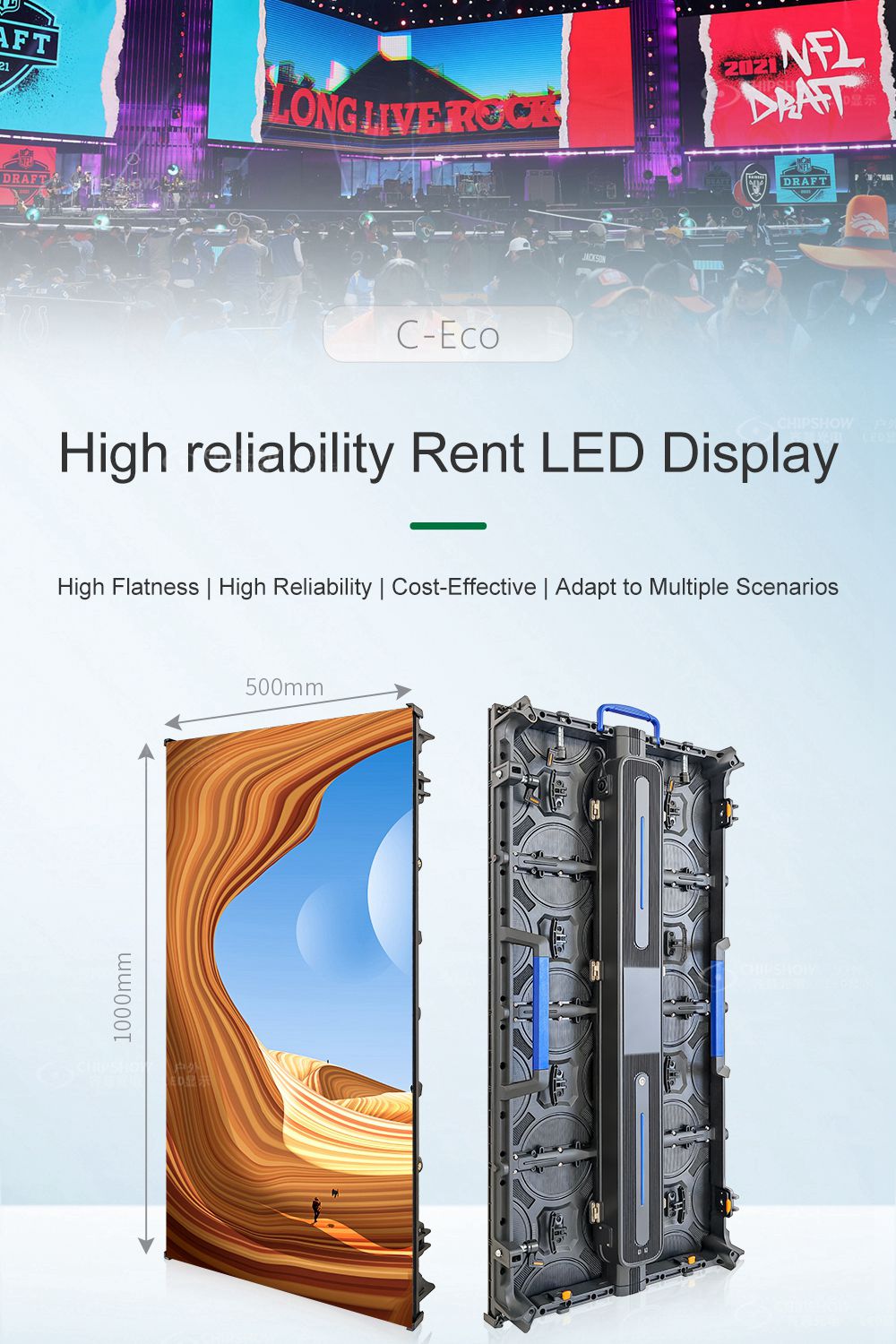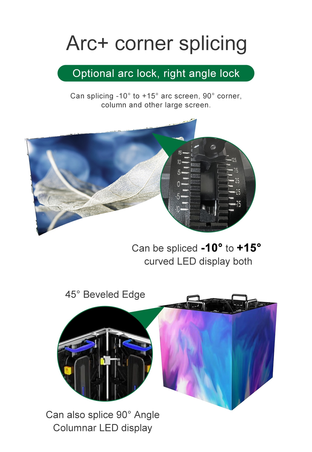 * Adaptable to Multiple Scenarios: Compatible with 500*500mm and 1000mm cabinets, allowing mixed installation. The curved version supports configurations for -10° to 15° arc screens, 90° corners, and column installations for large displays.