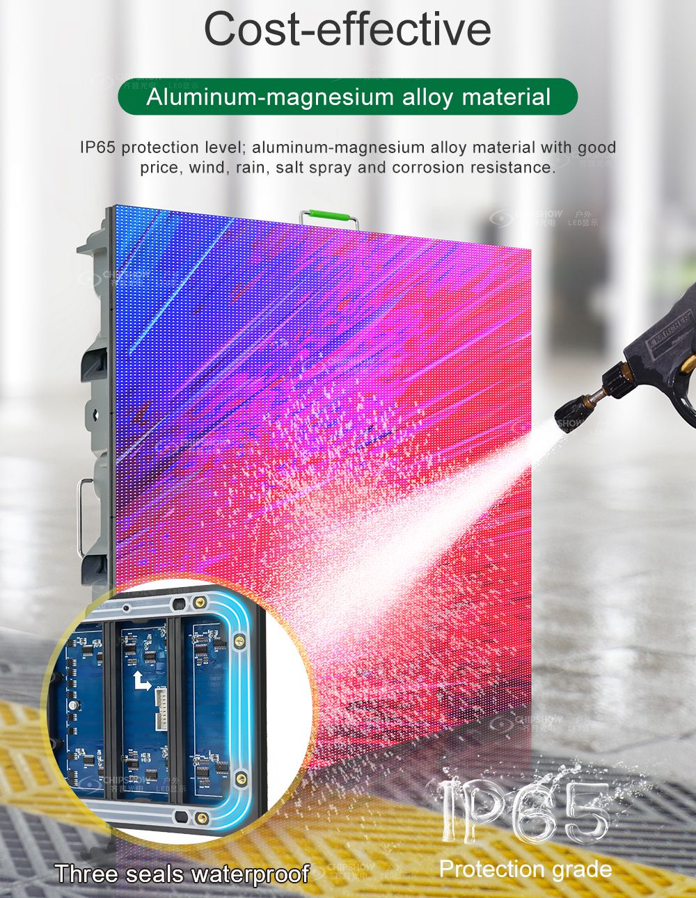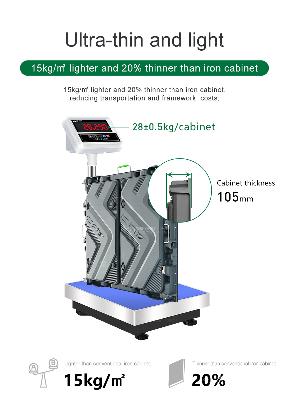 2 Ultra-thin: the die-casting aluminum cabinets are 20% thinner and 15kg/㎡ than iron cabinets, which helps reduce transportation and framework costs significantly;