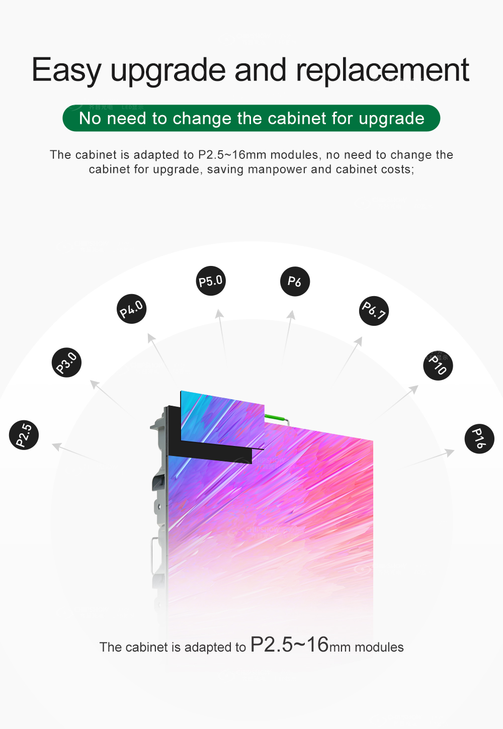 3 Easy to upgrade and replace: the cabinets are adapted to our P2.5~P16 modules; so you do not have to change the cabinets for an upgrade, this will save a lot of manpower and cabinet costs;