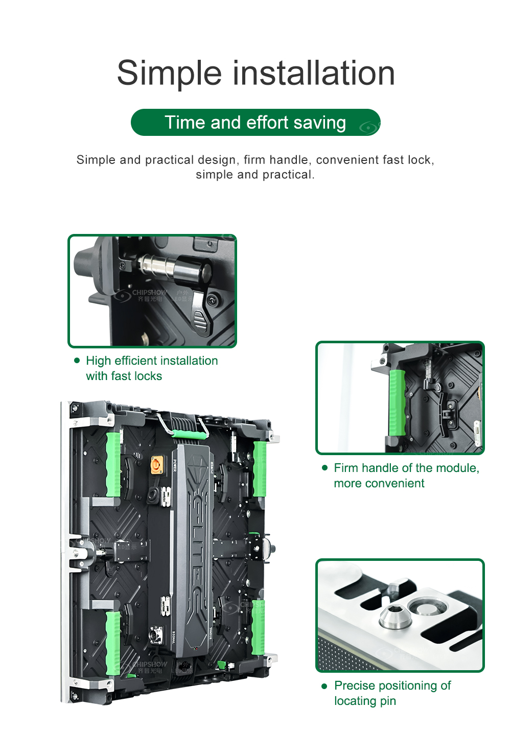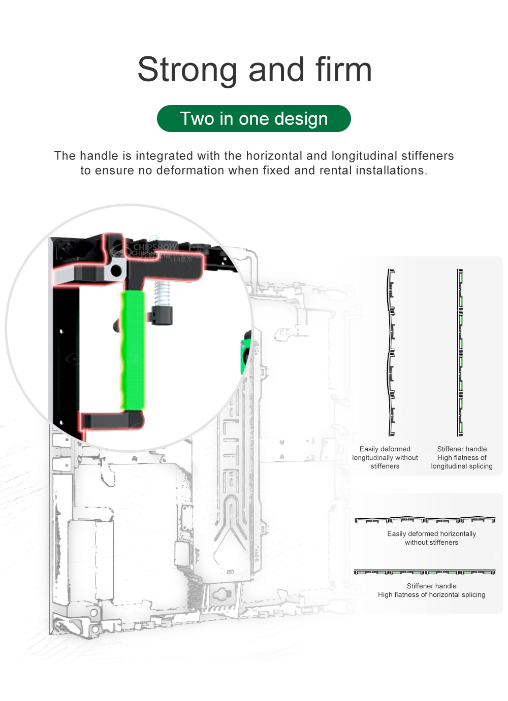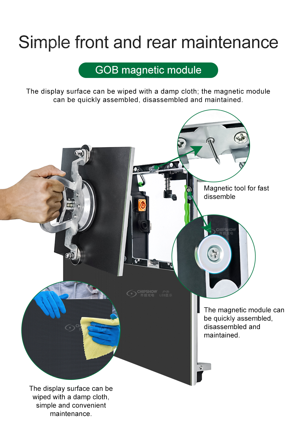 3. Magnetic design: The magnetic module can be maintained from front and rear; the magnet between the cabinets are accurately positioned and installed, and very cost-effective for rental installation.