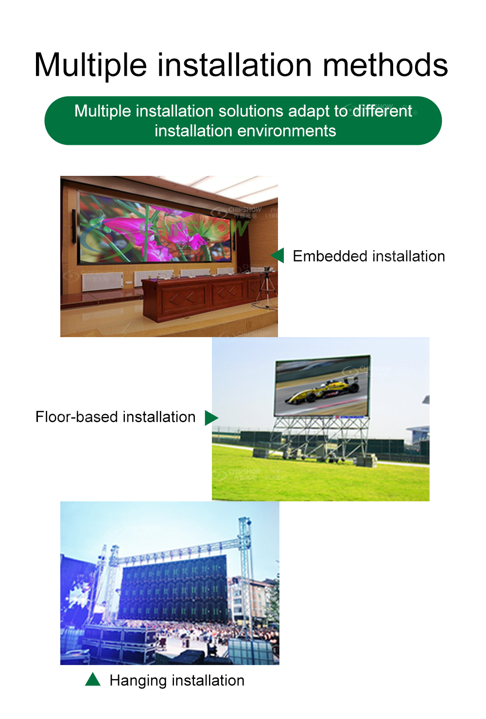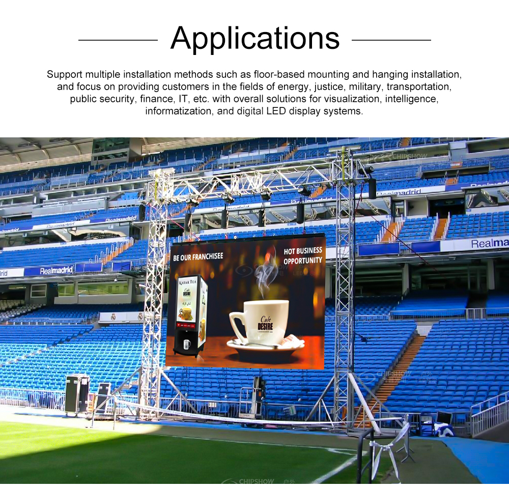 7. Multi applications: Support multiple installation methods such as floor-based mounting and hanging installation, and focus on providing customers in the fields of energy, justice, military, transportation, public security, finance, IT, etc. with overall solutions for visualization, intelligence, informatization, and digital LED display systems.