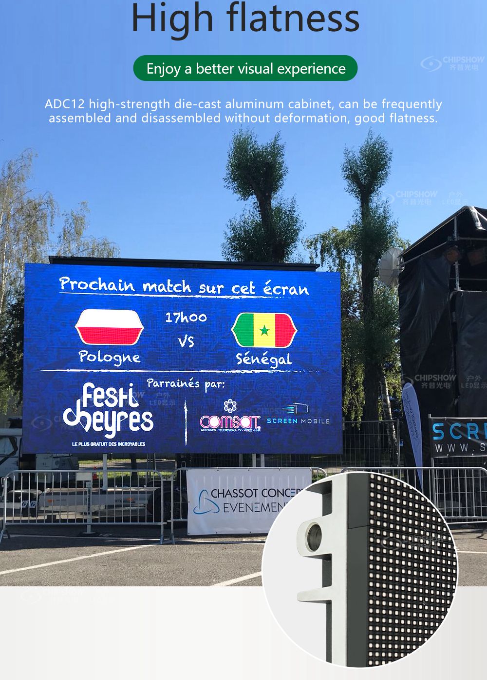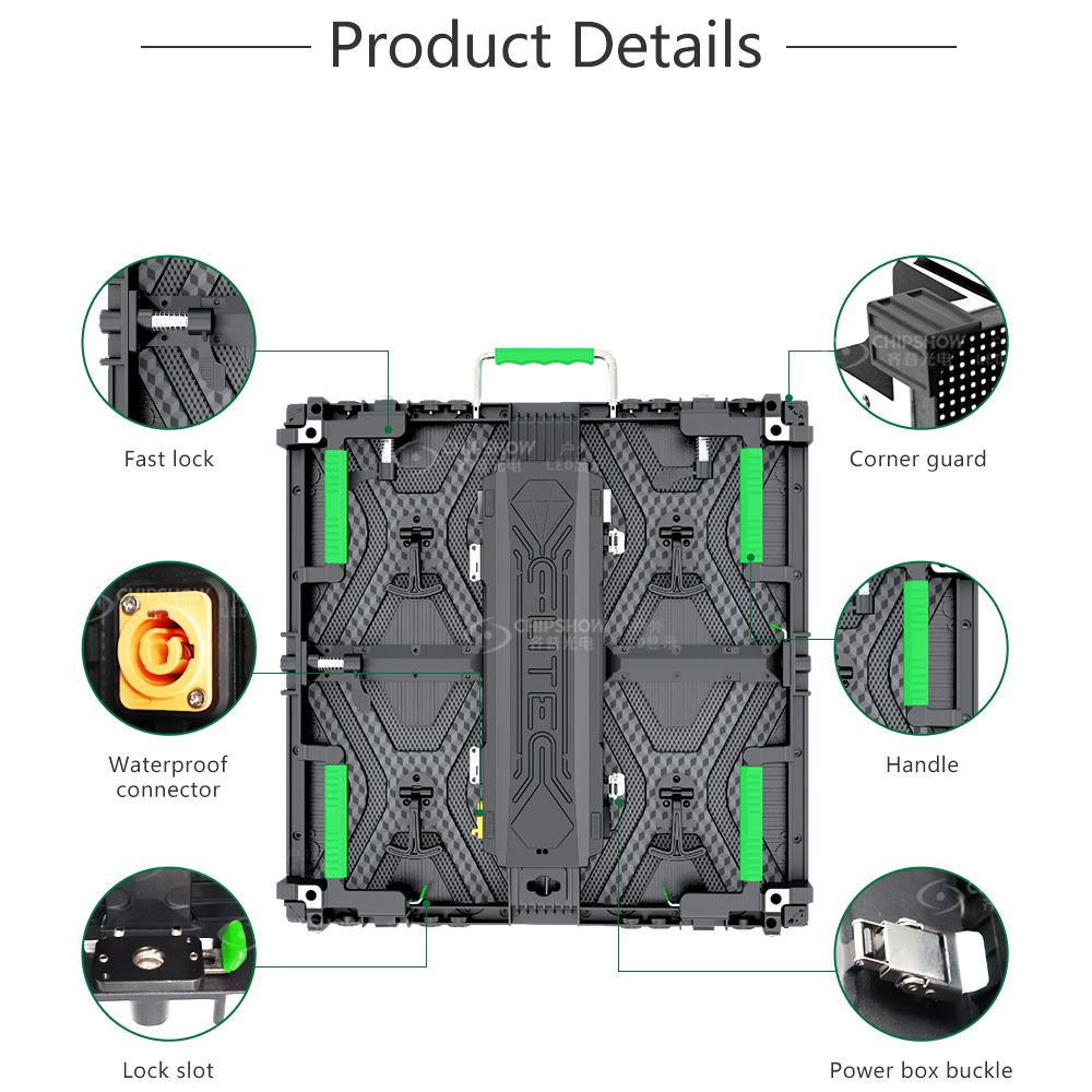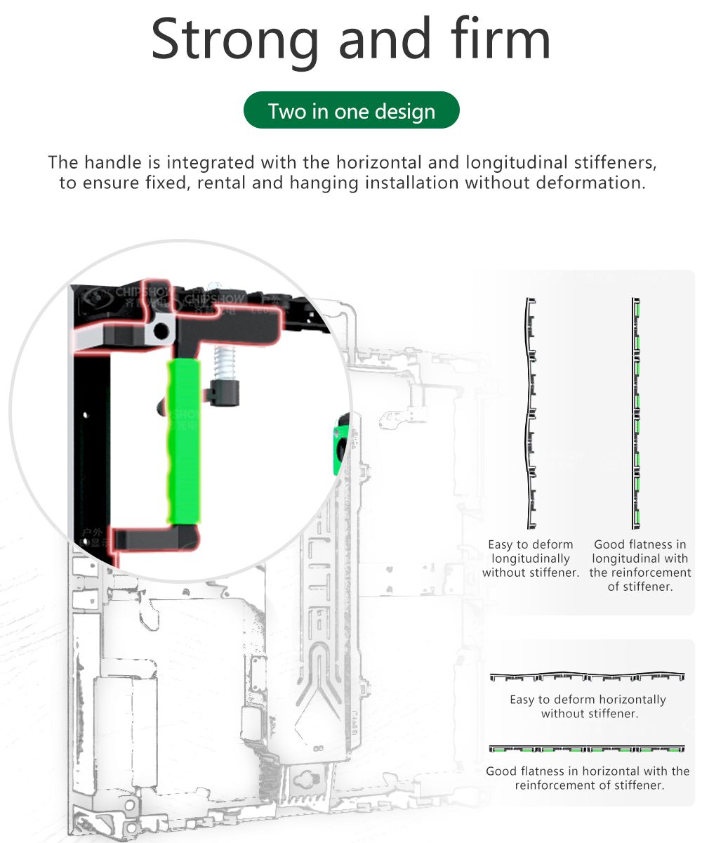 1 Good flatness: the screens adopt die-cast aluminum (tensile strength: ADC-12) cabinets for rental applications. The cabinets can be assembled and disassembled frequently without deformation;