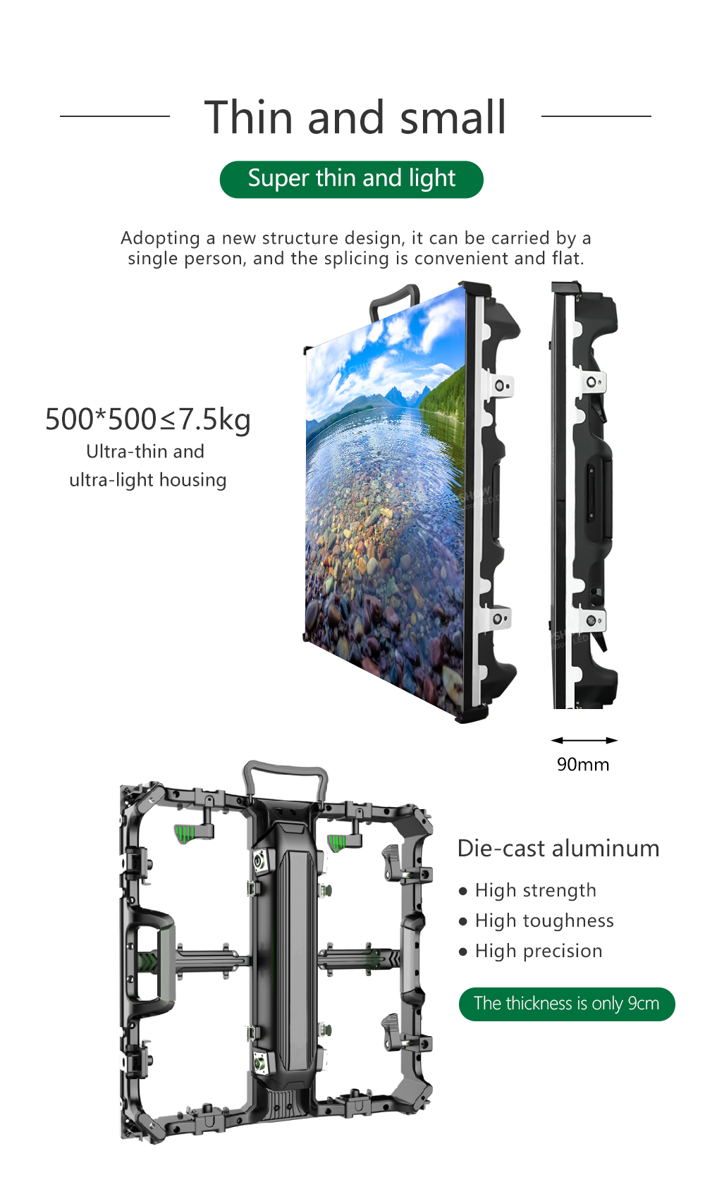1. High precision cast aluminum cabinet, ultra-thin and light weight, 500 * 500 ≤ 7.5KG/cabinet, with a thickness of only 90mm;