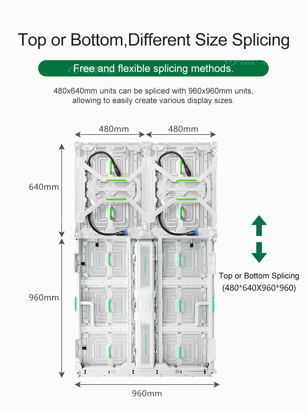 Flexible assembly: the small unit size (480mm * 640mm) provides convenience for users of assembly of different sign/signage/billboard sizes; it also supports splicing with the C-Slim big-sized cabinets (size: 960mm * 960mm); for example, a display screen with the 16:9 aspect ratio can be easily spliced;