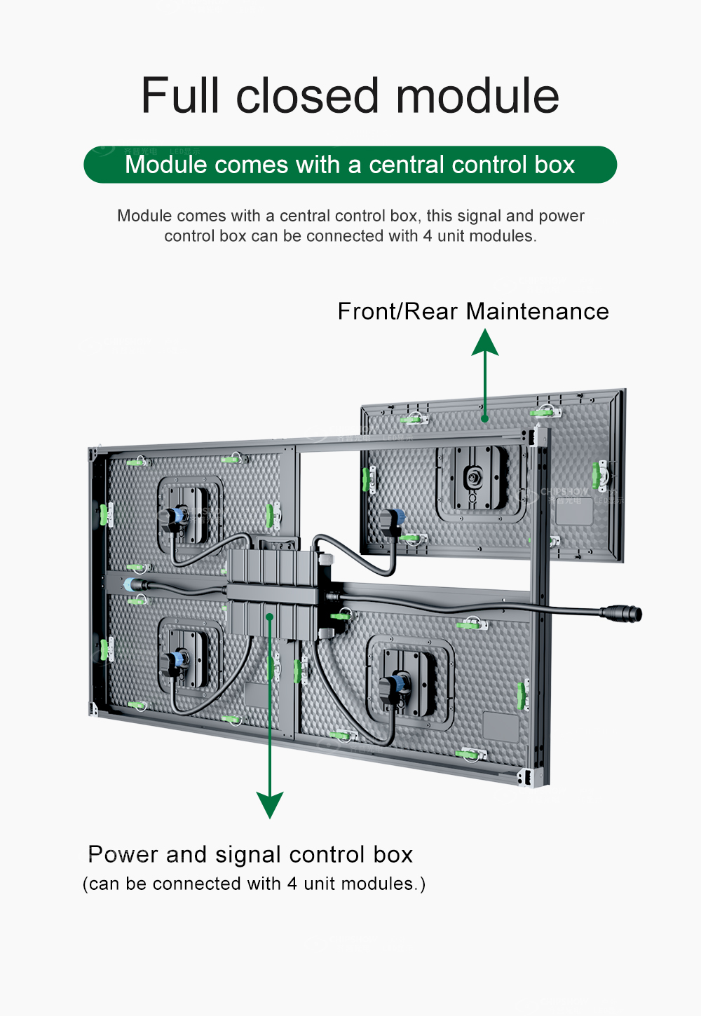 1 Fully enclosed LED modules: every module has a central control box and a power supply box that is connected with 4 unit models;