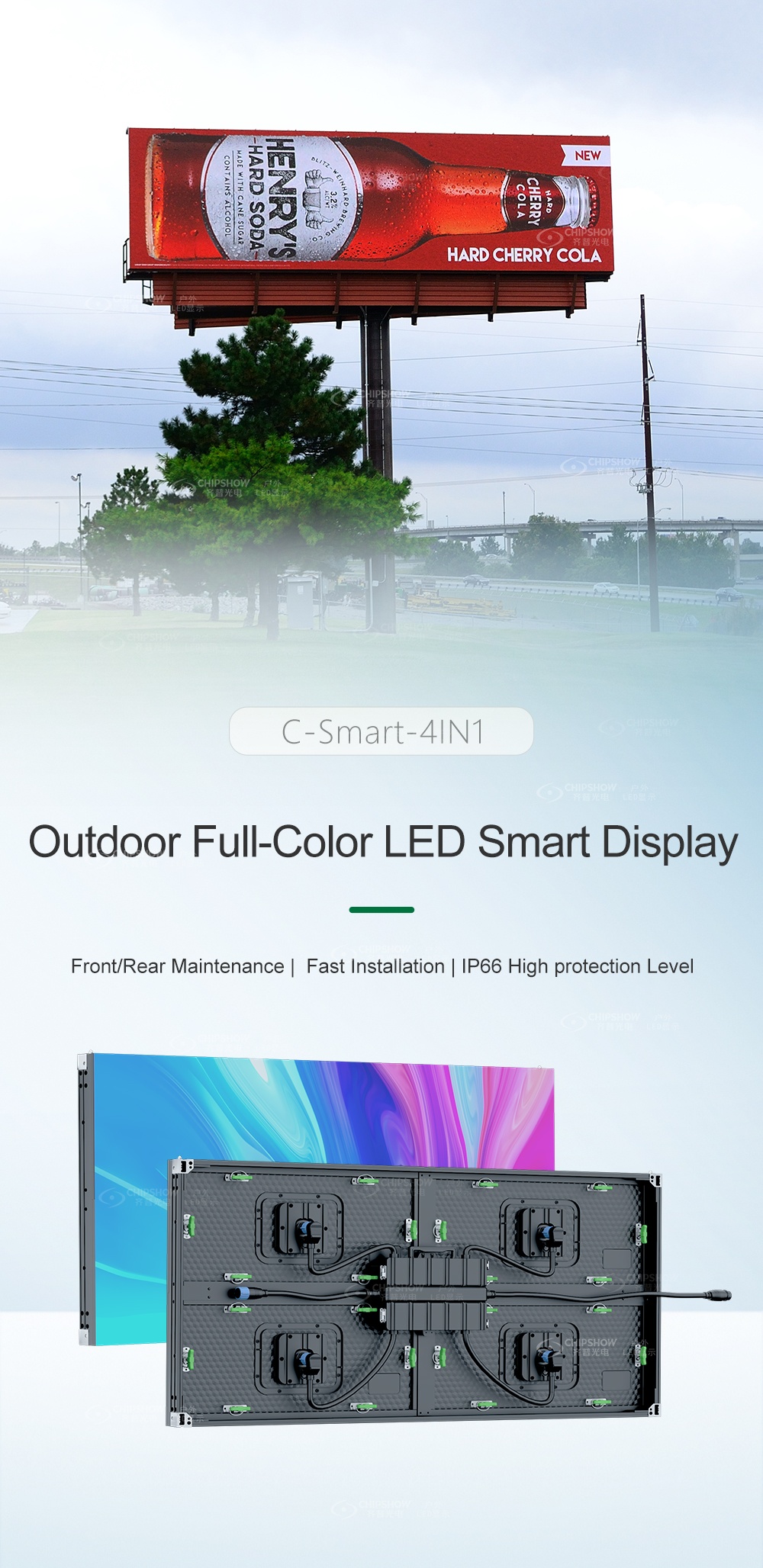 C-Smart 4-in-1 outdoor LED video sign – Low structural cost (P2.96)If you are interested in our products and want to know more details,please leave a message here,we will reply you as soon as we can.