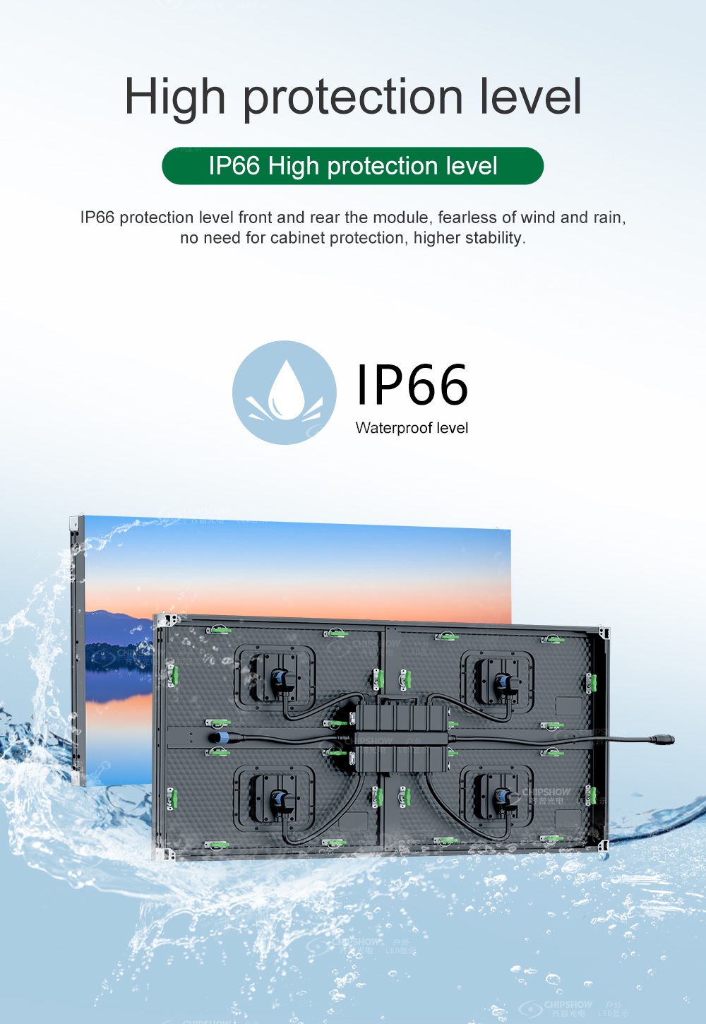 7 High-level protection: the fully-enclosed modules with a rating of IP66 ensure the screens can be seasoned to various outdoor conditions;