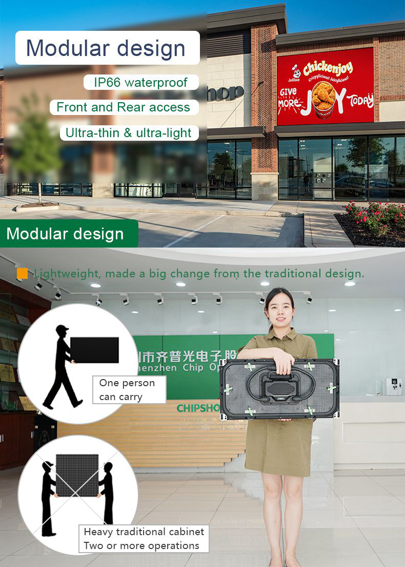 2 Fully modular design without cabinet: bracket + fully enclosed module= large screen, saving the framework and cabinet cost;