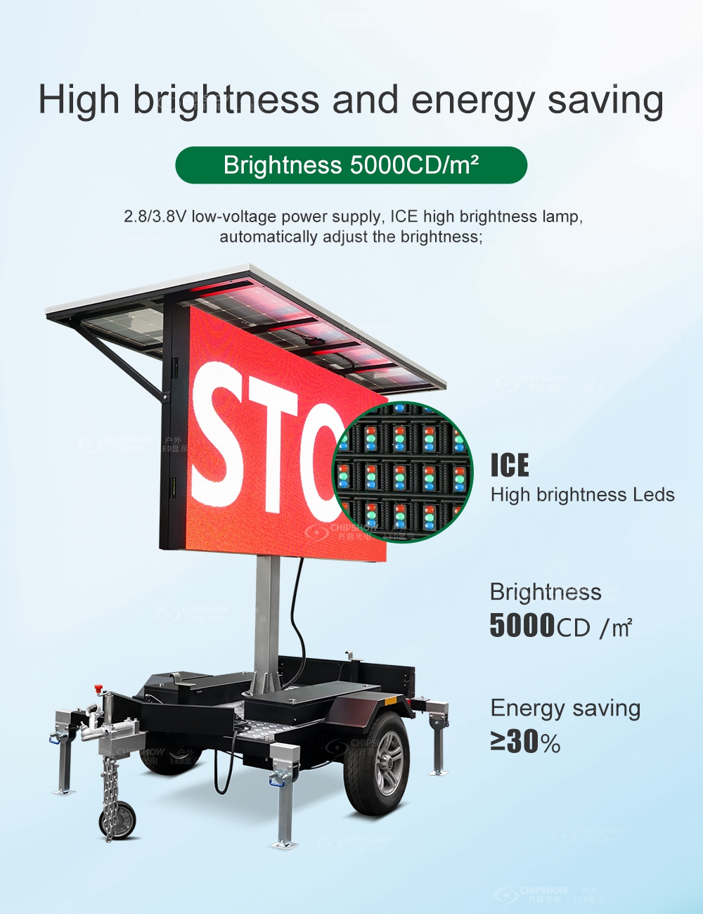 Solar charging+9.6KWH large capacity battery, which can continuously power on the LED display 365 days a year;
