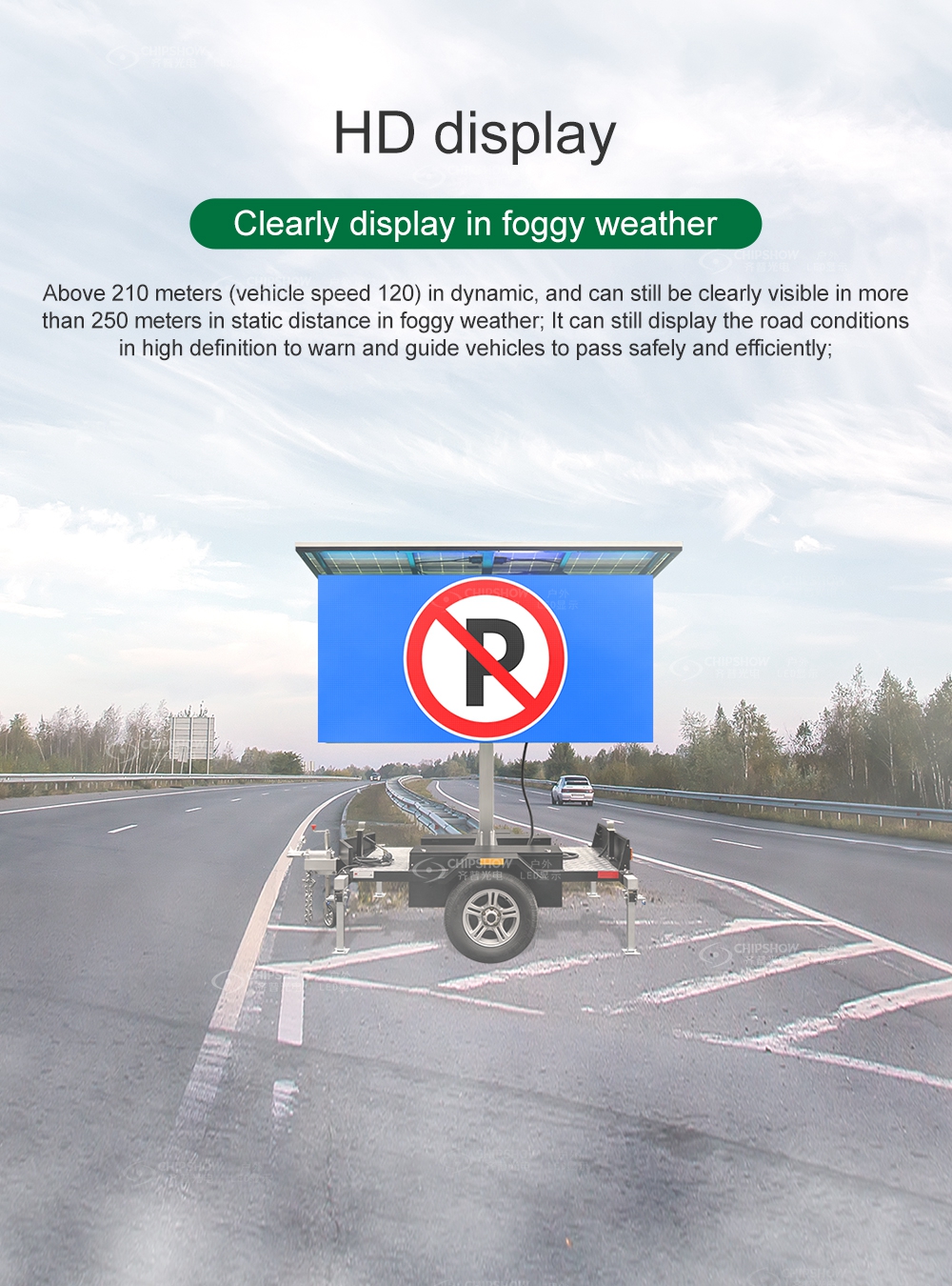 HD display: Above 210 meters (vehicle speed 120) in dynamic, and can still be clearly visible in more than 250 meters in static distance in foggy weather; It can still display the road conditions in high definition to warn and guide vehicles to pass safely and efficiently;