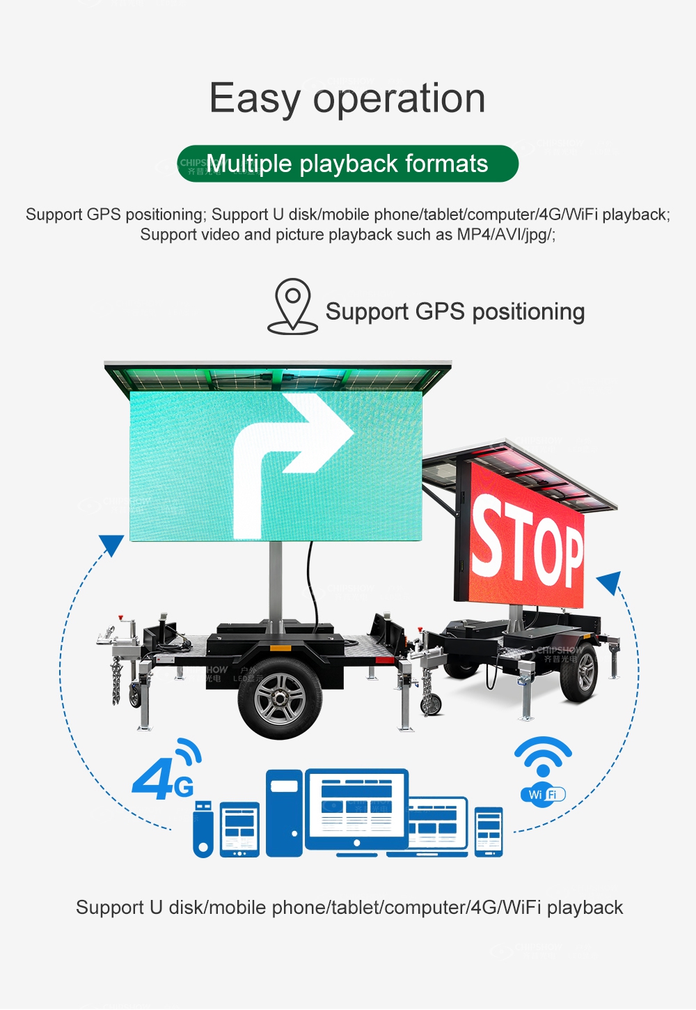 Support GPS positioning; Support U disk/mobile phone/tablet/computer/4G/WiFi playback; Support video and picture playback such as MP4/AVI/jpg/;