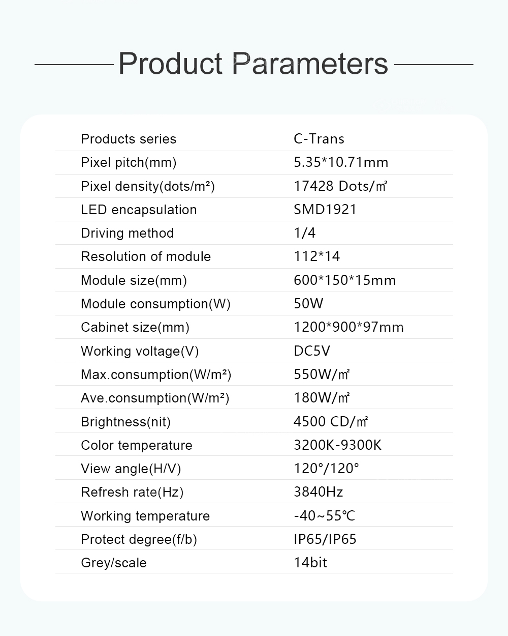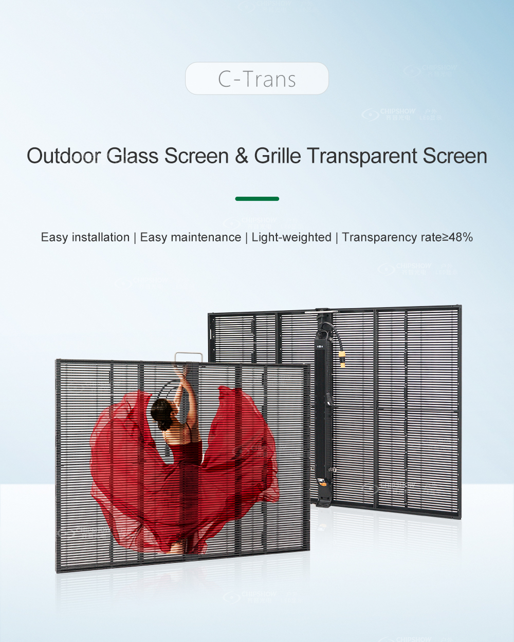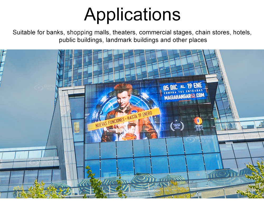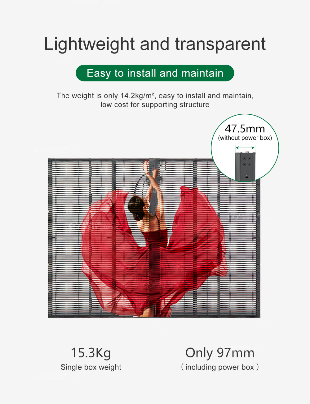 2 High transparency: the transparency of the screen is more than 48%; when mounted on a glass wall, the screen turns into a lifelike video wall; and you can still get a clear outward view through the transparent LED screen;