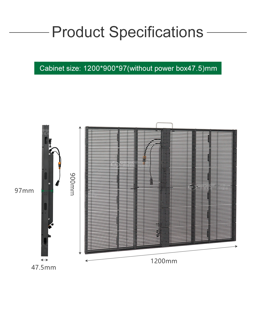 1 Light-weight: the weight is only 14.2kg/㎡,the screen just weights 15.3kgs(cabinet thickness without power box: 47.5mm, cabinet thickness with power box: 97mm),